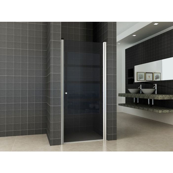 Nisdeur met profiel 900x2000 8mm. NANO glas. Verstelbaar van 89 - 91cm. Links- en rechts-scharnierend naar binnen- of naar buiten scharnierend (kan niet beiden) Deur voorzien van liftsysteem 8mm veiligheidglas met. NANO (anti-kalk) coating. Uitvoering: rookglas. Aluminium profielen metalen knoppen, verchroomd. Magneetsluiting. NANO-coating: Op microscopisch niveau ziet de wereld er heel anders uit. In het geval van glas is er dan te zien dat een product gemaakt van glas heel veel kleine open poriAn heeft. Door deze poriAn kunnen vuil en kalk zich snel hechten. Door met (machinale) rollers. NANO-coating aan te brengen worden deze poriAn adichtgesmeerda en hechten vuil en kalk zich veel minder snel aan het glasoppervlak. NANO-coating zorgt er dus voor dat het product langer schoon blijft en kalk en vuil zich minder snel hechten. Onderhoudsarm dus.